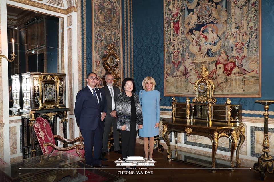 Lors de la visite en France avec le président Moon Jae-in en octobre 2018, la Première dame Kim Jung-sook (deuxième à droite) pose pour une photo au Louvre avec la Première dame française Brigitte Macron (première à droite) à côté d'un bureau du XVIIIe siècle de Maximilien II de Bavière qui a été restauré en utilisant le papier traditionnel hanji fabriqué à Jeonju, dans la province de Jeolla du Nord. ⓒ Compte Facebook de Cheong Wa Dae